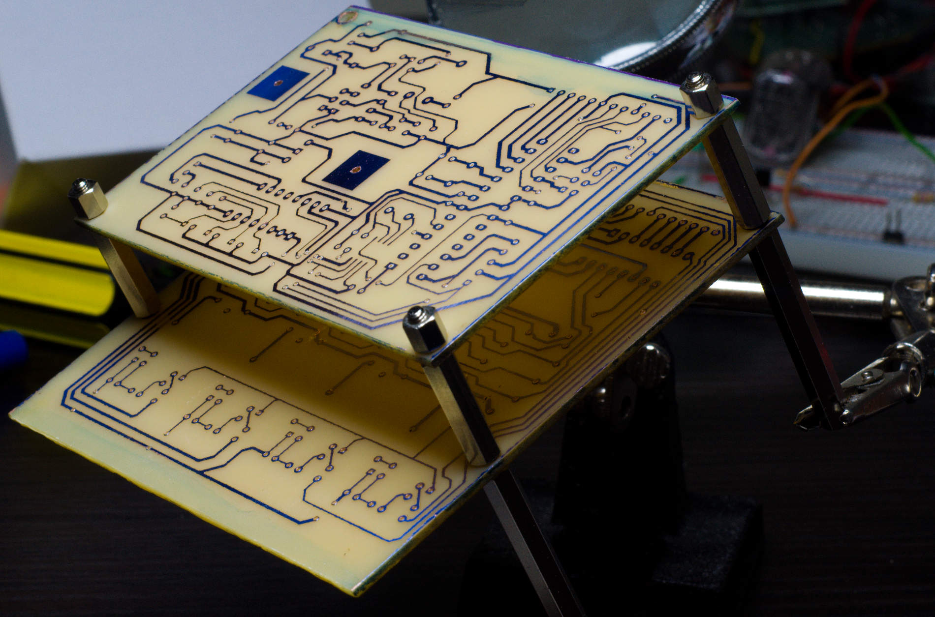 Like the prototype, the time keeping is being handled by a DS1337 RTC, but now the whole clock fits into a single 160mm * 100 mm single sided PCB board, including the nixies themselves. The nixie boost converter was also integrated into the main PCB.