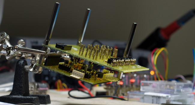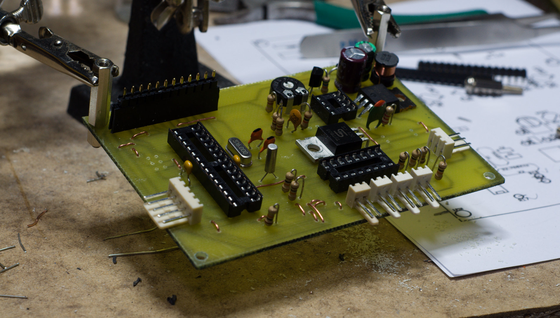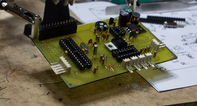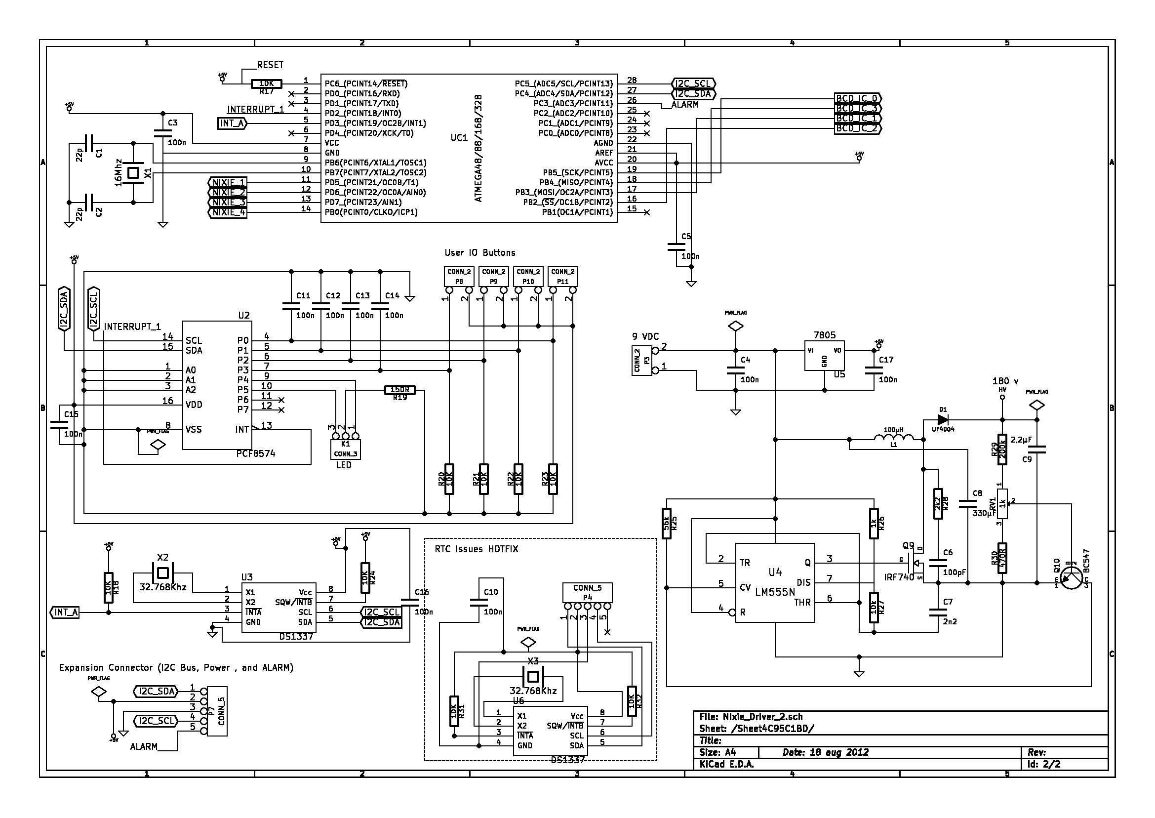 The atmega handles Nixie multiplexing, RTC time set / read, and user IO.