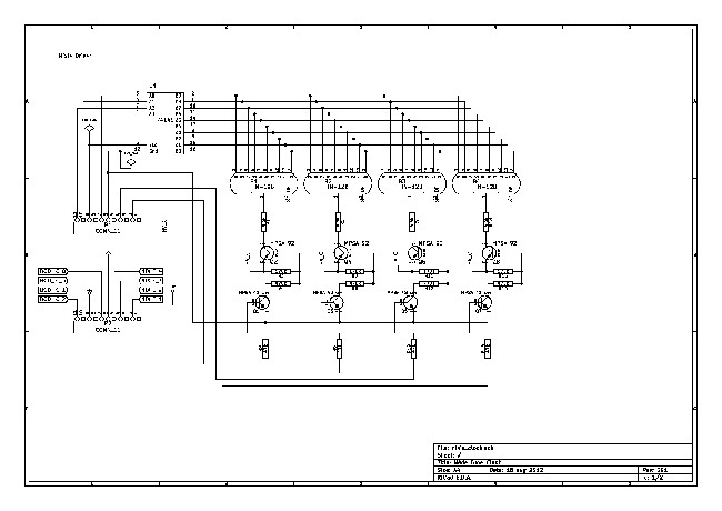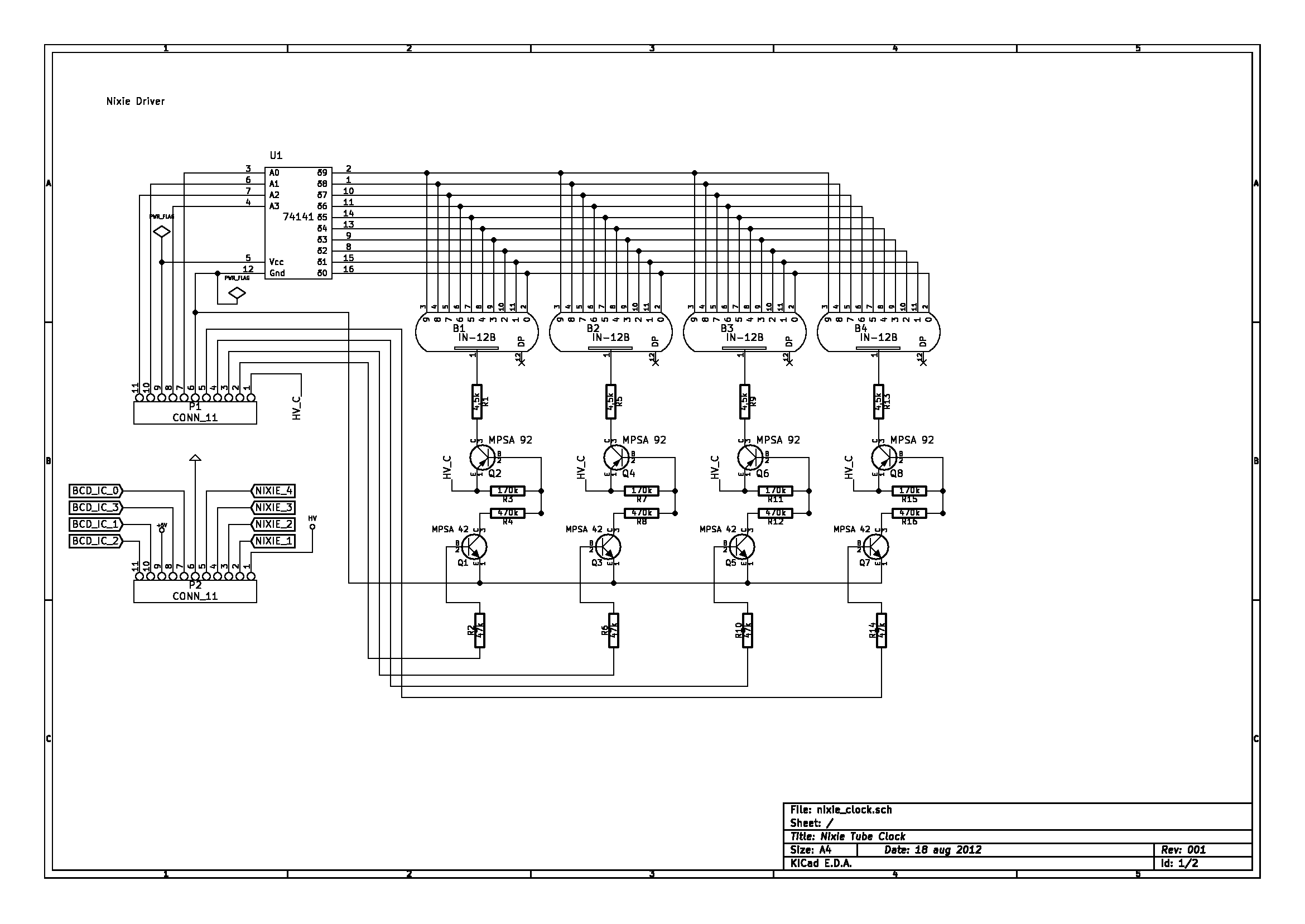 The final version features a more simple schematic, this time with the nixie driver built around a 74141 equivalent IC